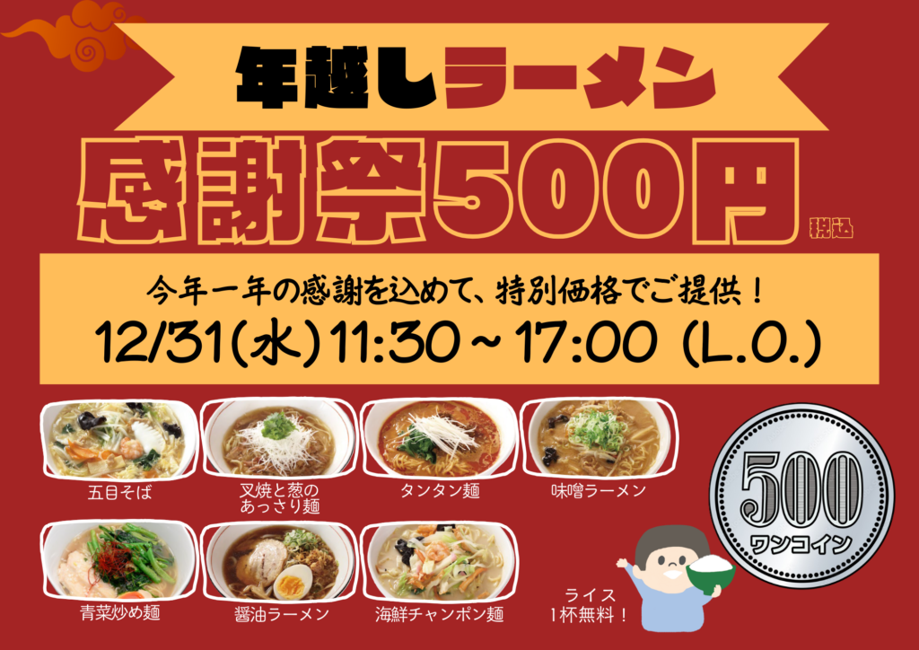 以上7種の麺類 どれでも500円(消費税込)でのご提供です。